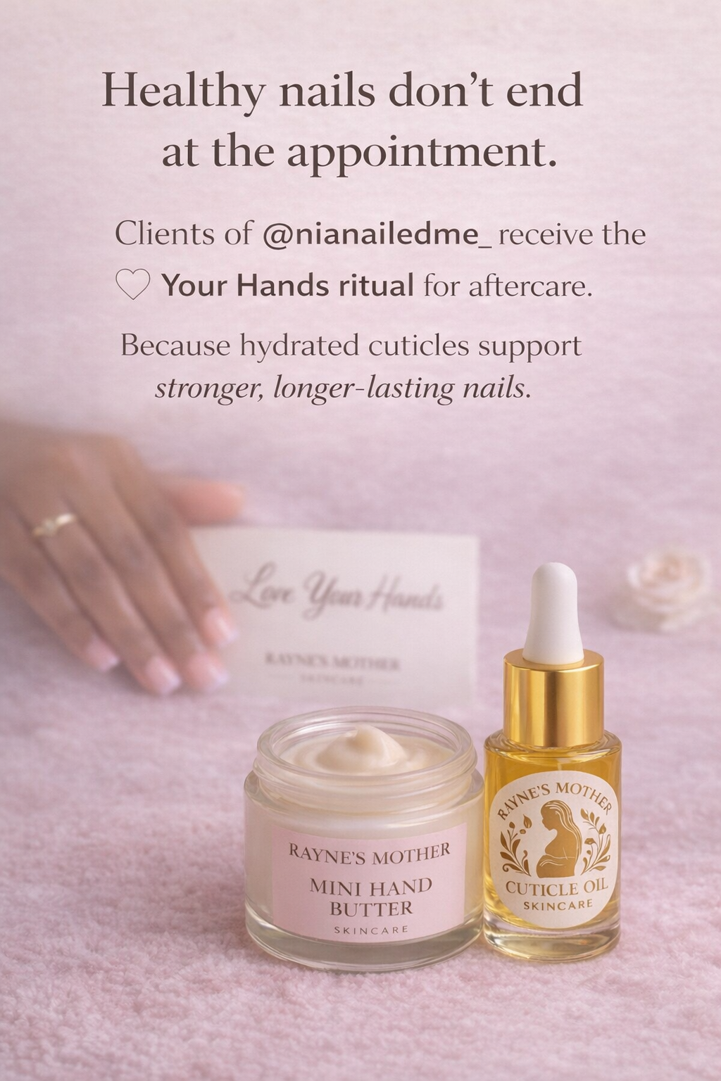 As an official Rayne’s Mother Nail Partner, Nia Nailed Me offers clients a thoughtful aftercare experience designed to support hydrated cuticles, softer hands, and longer-lasting nails.